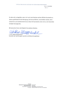 Es wäre sehr zu begrüßen, wenn sich noch mehr Besitzer solcher diffiziler Kunstwerke zu dieser qualifizierten Art der Reinigung, die Sie durchführen, entschließen würden, denn Unkenntnis und Unerfahrenheit hat an dieser Art Kunstwerke schon viel zu viel irreversible Schäden hervorgerufen. (…)